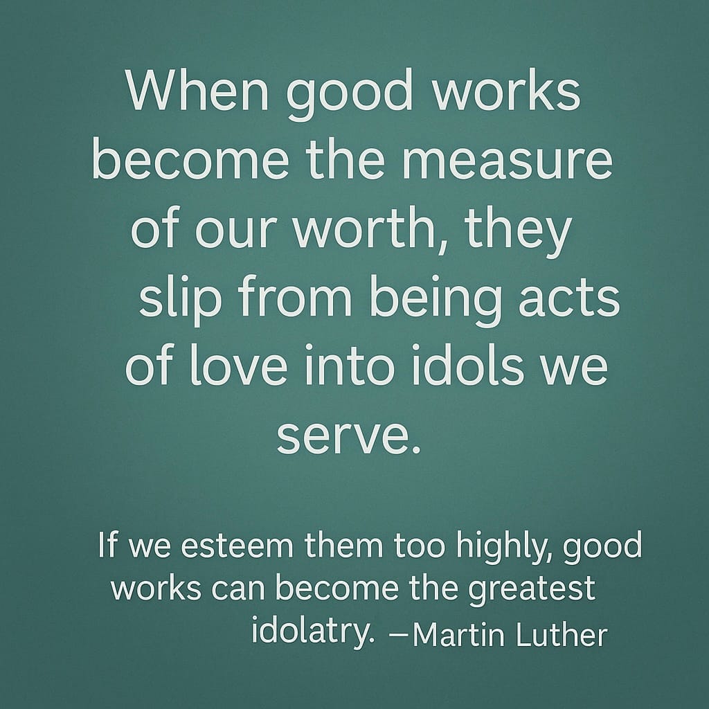 When good works become the measure of our worth, they slip from being acts of love into idols we serve. Martin Luther warned that even the best deeds, if esteemed too highly, can become “the greatest idolatry.” This idolatry is subtle—it hides behind busyness, service, and moral achievement. Yet beneath the surface it’s fueled by the lie that my identity hinges on my productivity or moral record.